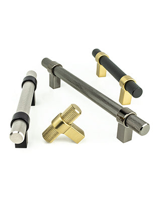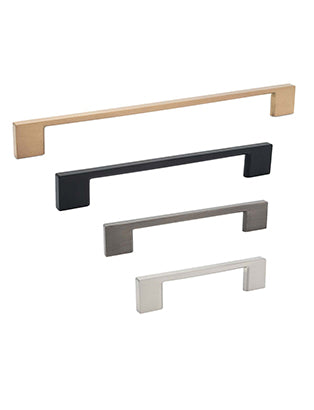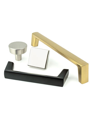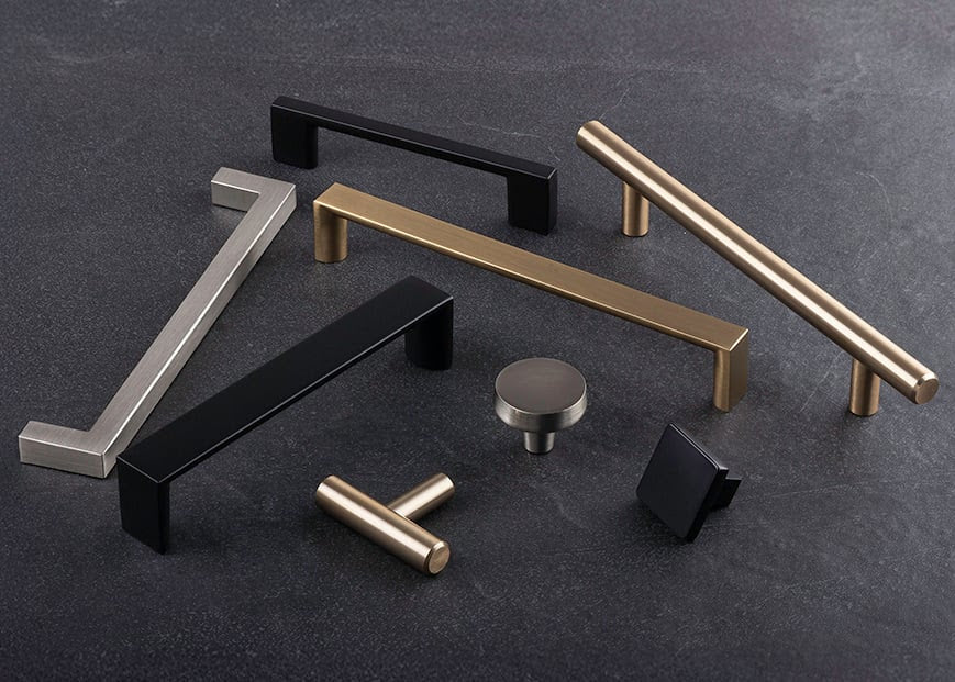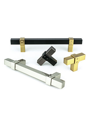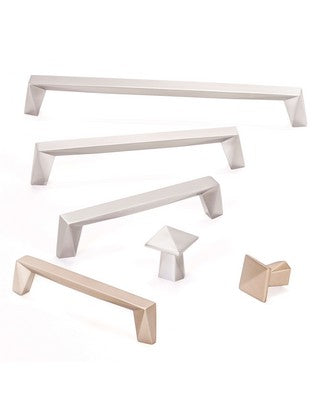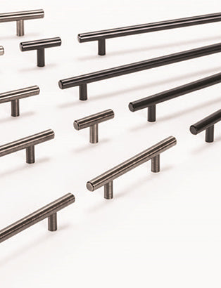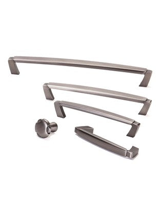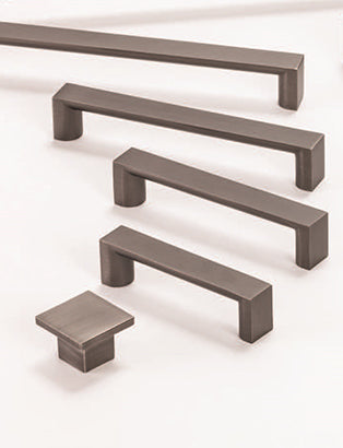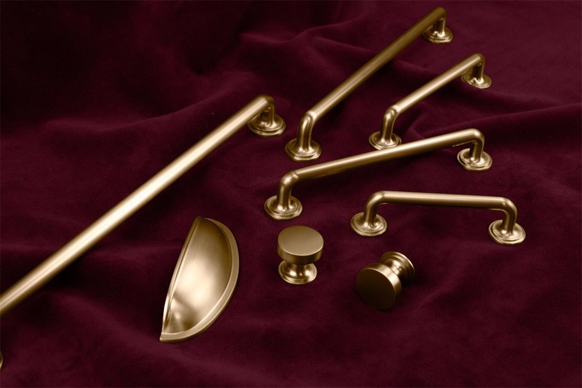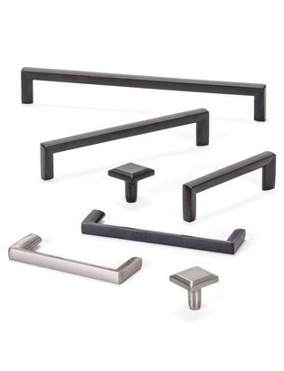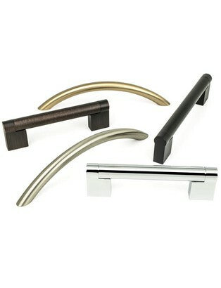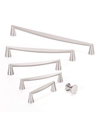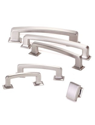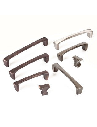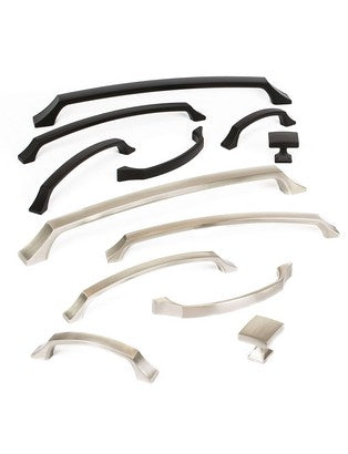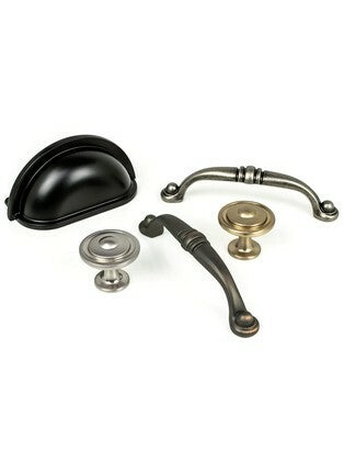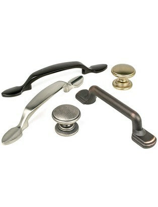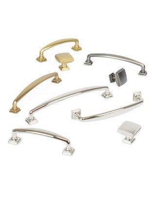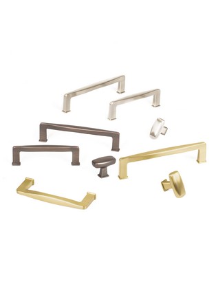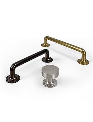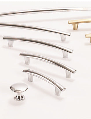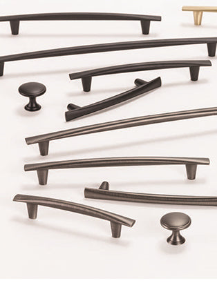 Comforting curves are supported by round and layered bases. Warm finishes embrace these cabinet knobs and pulls for a timeless take on yesterday's designs.